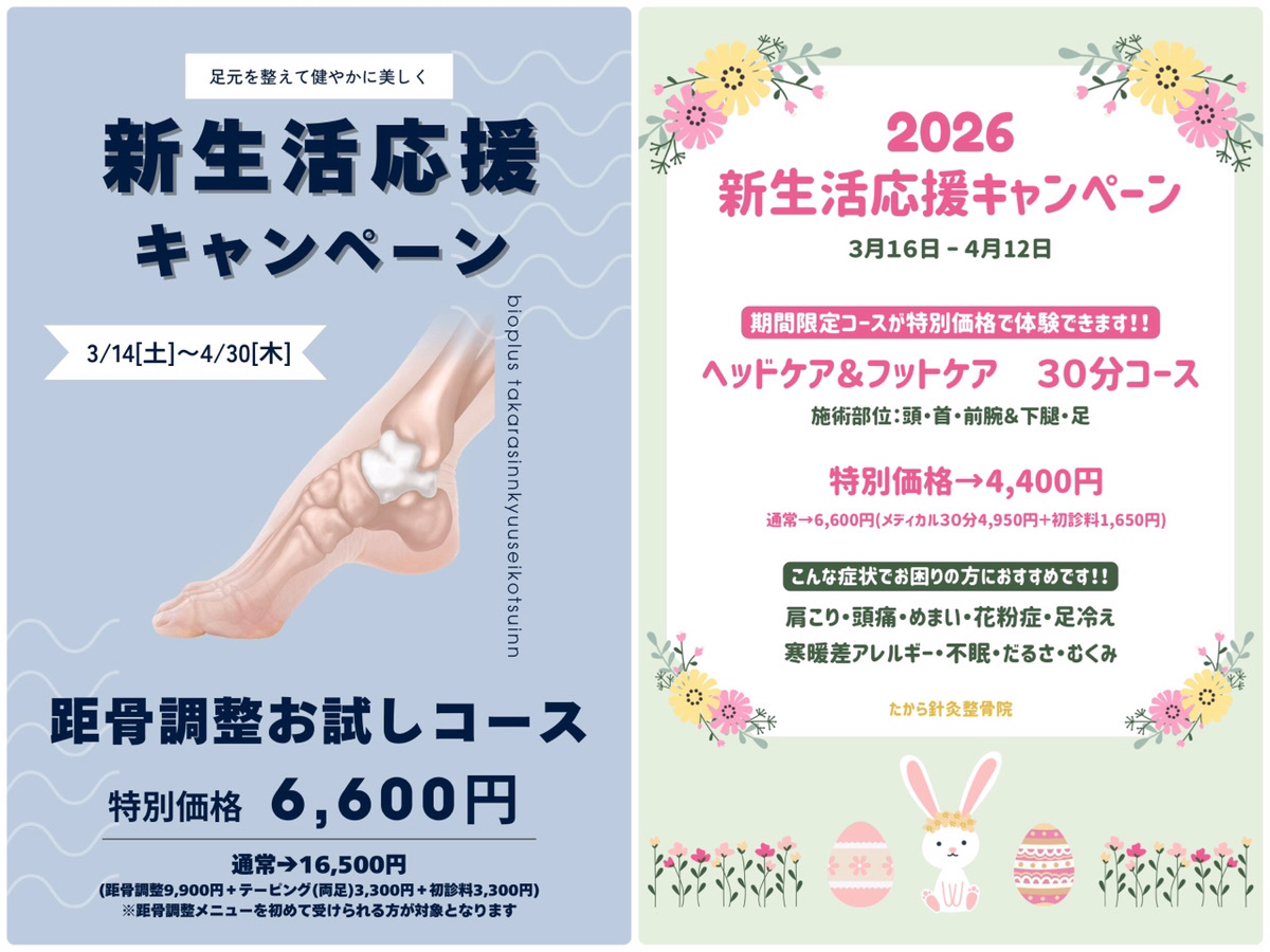 こんにちは!たから針灸整骨院ですキャンペーンが始まりましたのでお知らせいたします✨🌸新生活応援キャンペーン🌸今回のキャンペーンは全部で3つ✨3/14(...